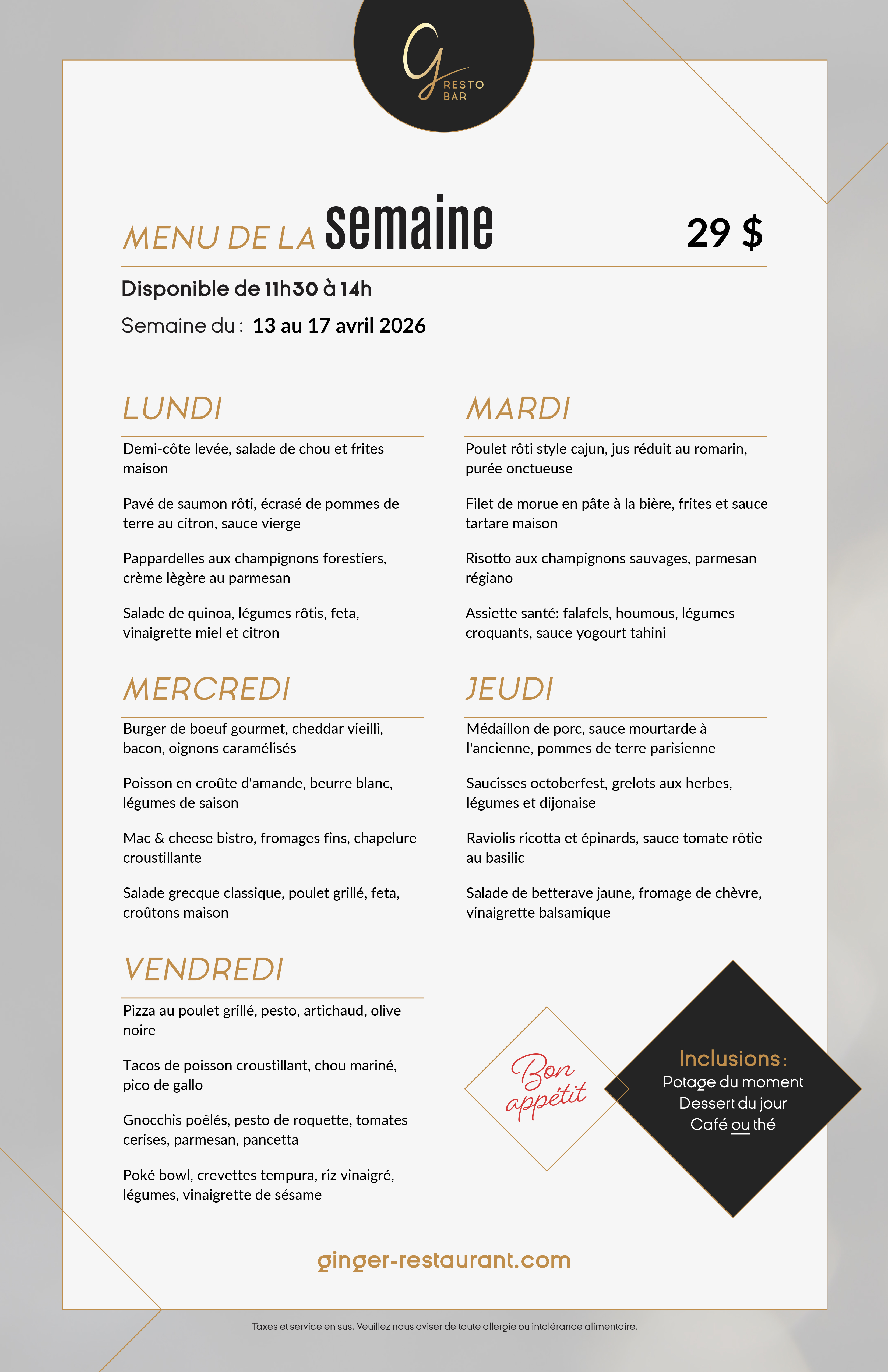 *Nos Buffets déjeuners sont offerts le samedi seulement et le dimanche en formule Brunch Bulles et Band.